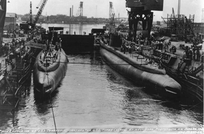 | Keywords: Piper (SS-409) & Threadfin (SS-410).jpg en USS Piper SS-409 USS Threadfin SS-410 double launching at Portsmouth Navy Yard Kittery ME; 26 June 1944 1944-06-26 http //navsource org/archives/08/419/0840911 jpg Image in http //www navsource org/archives/08/08410 htm navsource org USN photo courtesy of Scott Koen http //www ussnewyork com/ ussnewyork com PD-USN Uploaded with UploadWizard USS Piper SS-409 USS Threadfin SS-410 Portsmouth Naval Shipyard 1944-06-26 | ||||