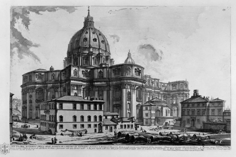 | Keywords: Piranesi-16010.jpg 16 16009 16011 7 VEDUTA DELL' ESTERNO DELLA GRAN BASILICA DI S PIETRO IN VATICANO 54 4 x 78 5 cm it Questa fu eretta in parte sopra i fondamenti del Circo Neroniano 1 Luogo ove si lavorano i Mosaici di S Pietro 2 Sagristia vicino a questa usciva dal terreno in piede l' Obelisco che ora si veda nella Piazza di S Pietro e faceva centro sulla Spina del Circo Sudd <sup>to</sup> 3 La gran Cupola nella cima della quale evvi la Palla di metallo dentro cui ci capiscono circa venti persone 4 Monte Vaticano 5 Avanzi di Colonne di Granito e marmo Pario le quali reggevano il Settizonio demolito da Sisto V Saint Peter's Basilica in art exterior Santa Maria della Febbre |