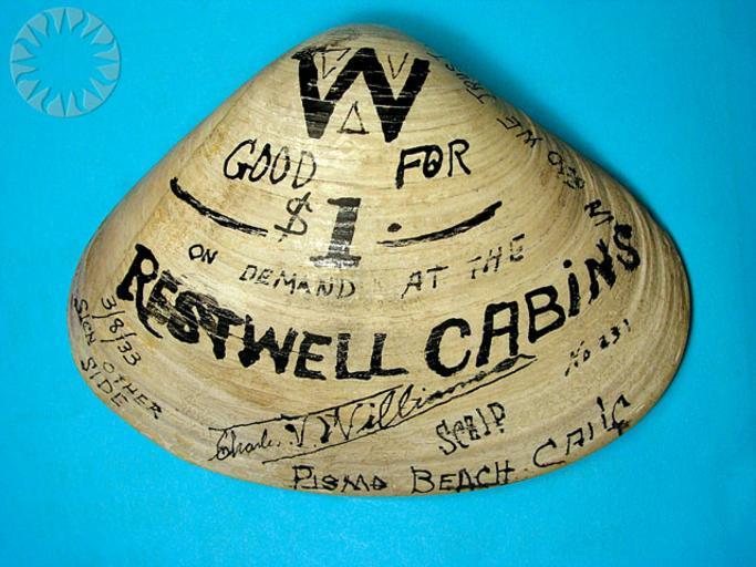 | Keywords: legendary coins legendarycoins numismatics money smithsonian probably public domain probablypublicdomain text SI Neg. 2005-27362. Date: 9/1/2005...When the Depression and resulting banking crisis hit their community, the residents of the coastal town of Pismo Beach, California picked an unusual but logical medium of exchange. The pismo is a species of clam with a very thick shell, then found in large numbers along the California coast and prized as a food. .A town named after the bivalves suggests an adequate supply of their shells. Perhaps with tongue in cheek, the merchants and officials of Pismo Beach (who were often the same people) decided to make the best of a bad situation, and to make the humble clam shell into an object of trade. This they did. The Chamber of Commerce and no fewer than eleven merchants issued clamshell scrip..Each piece was numbered, and each piece was signed on the front and on the back. As with the stamp notes of the Midwest, it was necessary to sign each clamshell on the back in order to keep it in circulation. No formal requirements may have existed, but informal pressure certainly would have endorsed the practice..Restwell Cabins issued "notes" in three denominations: twenty-five cents, fifty cents, and one dollar. The larger the amount, the larger the shell. The issue may have been partly intended as a spoof, or for sale to tourists, in the manner of German notgeld around 1920. Redemption would never be a problem because collectors would want to keep these pieces in their cabinets or trade them with their friends. .But it was also intended partly as a real, if unique, circulating medium. The Restwell Cabins issue bore the motto, "IN GOD WE TRUST." Each piece was numbered, and each was signed on the front and on the back. This specimen is dated March 8, 1933. This was in the middle of Roosevelt's national banking holiday, and it is exactly the time when we might expect to see people take money into their own hands. ..Credit: Tom Mulvaney (Smithsonian Institution) SI Neg. 2005-27362. Date: 9/1/2005...When the Depression and resulting banking crisis hit their community, the residents of the coastal town of Pismo Beach, California picked an unusual but logical medium of exchange. The pismo is a species of clam with a very thick shell, then found in large numbers along the California coast and prized as a food. .A town named after the bivalves suggests an adequate supply of their shells. Perhaps with tongue in cheek, the merchants and officials of Pismo Beach (who were often the same people) decided to make the best of a bad situation, and to make the humble clam shell into an object of trade. This they did. The Chamber of Commerce and no fewer than eleven merchants issued clamshell scrip..Each piece was numbered, and each piece was signed on the front and on the back. As with the stamp notes of the Midwest, it was necessary to sign each clamshell on the back in order to keep it in circulation. No formal requirements may have existed, but informal pressure certainly would have endorsed the practice..Restwell Cabins issued "notes" in three denominations: twenty-five cents, fifty cents, and one dollar. The larger the amount, the larger the shell. The issue may have been partly intended as a spoof, or for sale to tourists, in the manner of German notgeld around 1920. Redemption would never be a problem because collectors would want to keep these pieces in their cabinets or trade them with their friends. .But it was also intended partly as a real, if unique, circulating medium. The Restwell Cabins issue bore the motto, "IN GOD WE TRUST." Each piece was numbered, and each was signed on the front and on the back. This specimen is dated March 8, 1933. This was in the middle of Roosevelt's national banking holiday, and it is exactly the time when we might expect to see people take money into their own hands. ..Credit: Tom Mulvaney (Smithsonian Institution) |