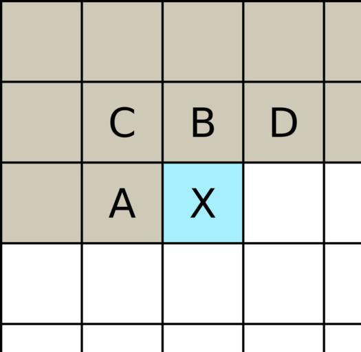 | Keywords: Pixel-prediction.svg  en Three neighboring samples around the sample to be predicted PNG's filter can use the data in pixels A B and C to predict the value for X Pixels that have already been processed are marked in grey the pixel currently being processed X is marked in cyan PNG kann die Daten der drei angrenzenden Bildpunkte A B und C verwenden um den Wert für X vorherzusagen Bereits verarbeitete Punkte sind grau markiert der aktuell zu bearbeitende X in cyan own ZooFari 2009-11-01 User ZooFari/Template SVG Check categories 2010 August 11 en wikipedia Portable_Network_Graphics en wikipedia Lossless_JPEG en wikipedia FELICS 5 PNG encoding |
