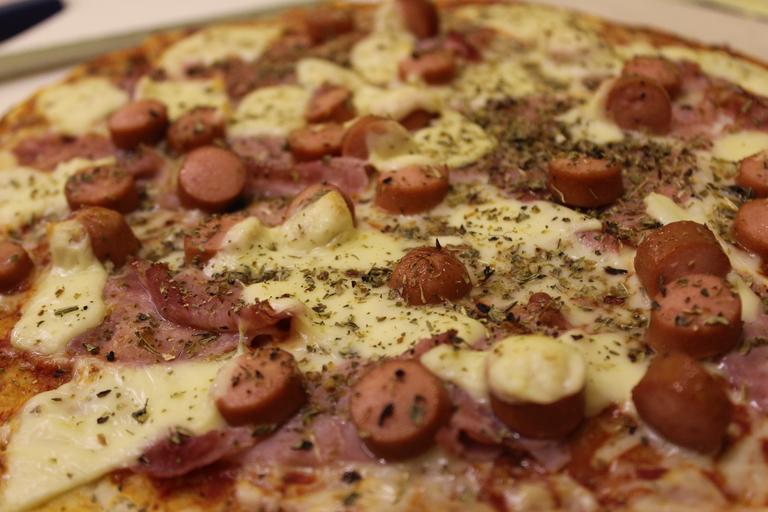 Keywords: pizza condiment sausage cheese mozzarella ham tomato origan food italian taste appetite