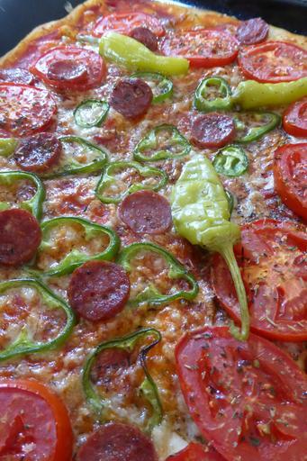 Keywords: pizza italian food pizza topping salami pepperoni tomatoes dough lunch dinner delicious