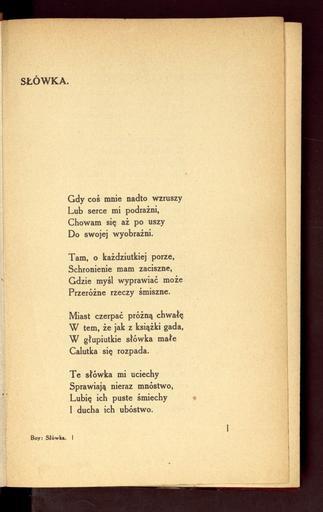 Keywords: PL Tadeusz Boy-Żeleński-Słówka 009.jpg Słówka zbiór wierszy i piosenek by w Tadeusz Boy-Żeleński 1874-1941 a Polish writer and translator of French literature Słówka zbiór wierszy i piosenek autorstwa w Tadeusz Boy-Żeleński Tadeusza Boya-Żeleńskiego pl polskiego pisarza i tłumacza literatury francuskiej http //www polona pl/dlibra/docmetadata id 8263 Cyfrowa Biblioteka Narodowa Polona Creator Tadeusz Boy-Żeleński Słówka zbiór wierszy i piosenek Series title Księgarnia Polska B Połonieckiego; E Wende Drukarnia Narodowa w Krakowie 1913 Lviv - Warsaw pl PD-old Słówka Tadeusz Boy-Żeleński |