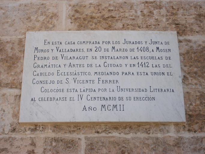 | Keywords: Placa commemorativa al Palau de Benicarló de València.JPG ca Placa commemorativa de la Universitat de València col·locada el 1902 Diu En esta casa comprada por los Jurados y Junta de Muros y Valladares en 20 de Marzo de 1408 a Mosen Pedro de Vilaragut se instalaron las escuelas de Gramática y Artes de la Ciudad y en 1412 las del Cabildo Eclesiástico mediando para esta unión el Consejo de S Vicente Ferrer Colocós eesta lapida por la Universidad Literaria al celebrarse el IV Centanario de su erección Año MCMII own Joanbanjo 2009-10 Palau de Benicarló Plaques in Valencia |