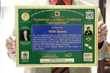 | Keywords: O presidente da Assembleia Legislativa, deputado Valdir Rossoni (PSDB), recebeu a comenda “Amigo das causas sociais no grau benemérito da paz e do social”, concedida pelo bispo João Pedro Nascimento, presidente do Comitê Mundial da Paz, na manhã desta quinta-feira (24). “É uma homenagem para alguém que está desempenhando um importante papel e representando o povo paranaense. O presidente tem sido corajoso e se comportado com valentia para que as coisas mudem”, afirmou Nascimento. Foto: Nani Gois / Assembleia Legislativa do Paraná O presidente da Assembleia Legislativa, deputado Valdir Rossoni (PSDB), recebeu a comenda “Amigo das causas sociais no grau benemérito da paz e do social”, concedida pelo bispo João Pedro Nascimento, presidente do Comitê Mundial da Paz, na manhã desta quinta-feira (24). “É uma homenagem para alguém que está desempenhando um importante papel e representando o povo paranaense. O presidente tem sido corajoso e se comportado com valentia para que as coisas mudem”, afirmou Nascimento. Foto: Nani Gois / Assembleia Legislativa do Paraná |