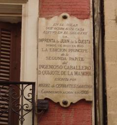 | Keywords: Placa edición príncipe Quijote segunda parte 1615.jpg Placa en el número 7 de la calle San Eugenio de Madrid colocada en 1905 El texto dice En el solar que ocupa esta casa estuvo en el siglo XVII la imprenta de Juan de la Cuesta donde se hizo en 1615 la edición príncipe de la segunda parte del Ingenioso Caballero D Quijote de la Mancha escrita por Miguel de Cervantes Saavedra Conmemoración en 1905 Own Don Quixote Calle de Atocha Madrid Plaques in Madrid Spanish inscriptions Plaques to Miguel de Cervantes Plaques installed in 1905 Plaques referencing 1615 |