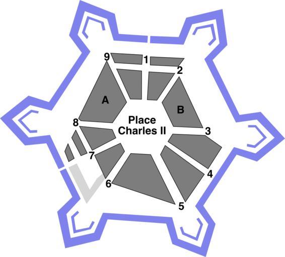 Keywords: Place Charles II (Charleroi).svg En bleu la forteresse de 1666 aujourd'hui détruite 1 - Rue Neuve 2 - Rue de la Régence 3 - Rue Vauban 4 - Rue du Gouvernement 5 - Rue d'Orléans 6 - Rue de la Montagne 7 - Rue de France 8 - Rue de Turenne 9 - Rue du Dauphin A - Hôtel de Ville B - Église Saint-Christophe Maps of Charleroi |