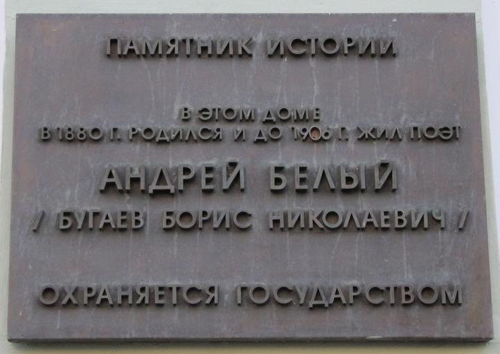 | Keywords: Plague Beliy Andrei Arbat.jpg en In this house was born in 1880 and lived until 1906 a prominent Russian poet Andrei Bely Boris Bugaev Moscow Arbat str 55 ru В этом доме одился в 1880 и жил до 1906 видный усский поэт Анд ей Белый Бо ис иколаевич Бугаев осква А бат ул 55 own Vladimir OKC Memorial wall signs in Moscow Arbat Street Andrei Bely |