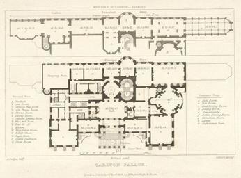 Keywords: Plan of Carlton Palace in 1821.jpg A plan of Carlton Palace in London dated 1821 This building is much more often called Carlton House but this plan was made in the brief period between the Prince Regent's accession to the throne as King George IV and the demolition of the mansion The lower plan shows the ground floor The upper plan shows the suite of reception rooms on the south side of the house which was at basement level approaching from the entrance on the northern side but at ground level in the garden due to the slope of the site The rest of this level comprising service rooms is not shown There was also an upper floor which is not shown The stable block was detached and was located at the eastern end of the garden The scale bar at the bottom shows 100 feet 30 5 metres PD-old Carlton House Floor plans of palaces |