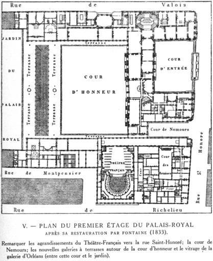 | Keywords: Plan du premier étage du Palais-Royal après sa restauration par Fontaine 1833 - Espezel 1936 p201.jpg Palais-Royal in Paris after its restoration in 1833 to designs by Pierre-François-Léonard Fontaine in which the support facilities of the Théâtre-Français were enlarged including the addition of the Cour des Remises ; new galleries with terraces around the Cour d'Honneur were added; and the Galerie d'Orléans between the court and the garden was glazed Scan Pierre d'Espezel Le Palais-Royal Paris Calmann-Lévy 1936 p 201 1990778 architect 1781 Creator Victor Louis architect 1833 Creator Pierre-François-Léonard Fontaine 1833 Plans of the Palais-Royal 1833 Pierre François Léonard Fontaine PD-old-100 |