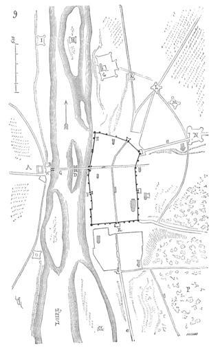 | Keywords: Plan.Orleans.XVe.siecle.png Pour l'intelligence de ce qui va suivre il est nécessaire de présenter ici un plan de la ville d'Orléans avec son enceinte au XV<sup>e</sup> siècle et ses abords fig 9 L'armée anglaise se présenta donc comme nous l'avons dit le 12 octobre 1428 devant la tête du pont d'Orléans du côté de la Sologne Les maisons du faubourg des Portereaux et le couvent des Augustins sis en A avaient été détruits par les habitants pour que les ennemis ne pussent s'y loger Les Anglais dirigèrent leurs attaques contre le châtelet des Tournelles B et le boulevard qui le couvrait Après trois jours d'attaques le fort n'étant plus tenable les Orléanais l'abandonnèrent en l'incendiant et en coupant une arche du pont en C Ils se fortifièrent dans le châtelet de la Belle-Croix construit sur le pont même à la hâte et en bois; et dans la bastille Saint-Antoine située en D Les Anglais réparent le fort des Tournelles où leur commandant le comte de Salisbury fut tué d'un boulet de pierre lancé de la tour Notre-Dame en E Ne se trouvant pas assez en force pour continuer le siége le 8 novembre ils se retirèrent vers Jargeau et Beaugency en se contentant de laisser une garnison dans le châtelet des Tournelles Les Orléanais mirent à profit ce répit on abattit tous les édifices et maisons des faubourgs sur la rive droite; églises couvents hôtels tout fut brûlé et rasé de manière à ne laisser en dehors des remparts qu'un espace vide et déblayé Cependant la garnison anglaise du fort des Tournelles avait reçu des bombardes et envoyait dans la ville des projectiles qui pesaient jusqu'à 192 livres Deux grosses pièces mises en batterie à la poterne du Chesneau en F et une coulevrine montée sur le boulevard de la Belle-Croix causaient des dommages sérieux aux Anglais les deux canons de la poterne du Chesneau lançaient des boulets de pierre de 120 livres Viollet-le-Duc Map Viollet-le-Duc History of Orléans |