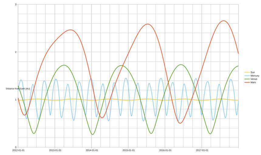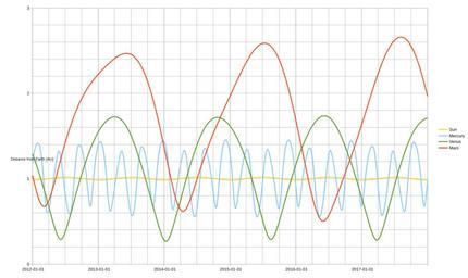 Keywords: Planet distances.svg en The distances in AU between Earth and the other inner planets and the Sun for 2012 “2017 Created with LibreOffice Calc using data from http //www fourmilab ch/solar/solar html 2014-11-12 own Jao other versions cc-zero Uploaded with UploadWizard Uncategorized 2014 November 12 |