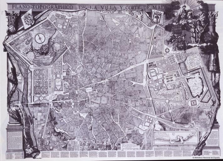 | Keywords: Plano de Madrid-Espinosa-1769.jpg  es Mapa de Antonio Espinosa de los Monteros 1769 ; digitalizado por la Biblioteca Nacional de España Ficha de información con texto de Félix Boix En el año 1769 D Antonio Espinosa de los Monteros y AbadÃa individuo de la Real Academia de San Fernando dibujó y grabó por orden del Conde de Aranda un gran plano de Madrid dividido en nueve hojas y en escala de 1 por 1 900 aproximadamente que dedicó al referido Ministro y en el que se representaron las obras entonces en construcción y hasta alguna de las proyectadas Para la formación de este plano se tuvieron presentes los minuciosos trabajos realizados en cumplimiento de la Cédula Real que dispuso se hiciese la visita general para la RegalÃa de aposento labor que comenzada en l750 y repetida en l766 llevaron a cabo cuatro arquitectos bajo la dirección de D Nicolás de Churriguera por quien están autorizados los planos de las 557 manzanas en escala de 1 por 300 a las que entonces se dió numeración que por primera vez aparece en el plano de Espinosa 1769 Servicio de cartografÃa del Ministerio de Fomento del Estado Español Biblioteca Nacional de España https //alfonsopinel files wordpress com/2013/07/mv13-11 jpg Fuente de la copia digitalizada Dibujado y grabado por Creator Antonio Espinosa de los Monteros 1732 “1812 PD-Scan PD-old-auto-1923 1812 Plano topográphico de la Villa y Corte de Madrid al Excmo Sr Conde de Aranda Capitán General de los Exércitos y Presidente del Consejo de Antonio Espinosa de los Monteros jpg Antonio Espinosa's Plano topographico de la Villa y Corte de Madrid 1769 |