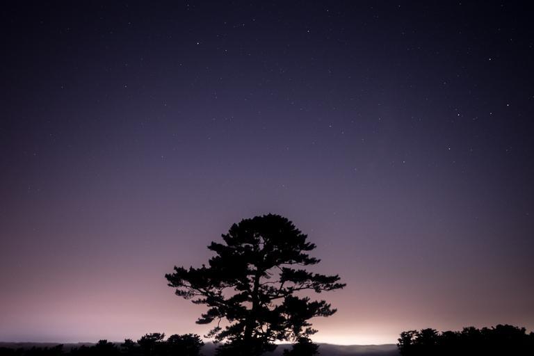 Keywords: plant nature tree conifere sunset twilight dusk evening dark stars sparkling shining cosmos universe astronomy astrophotography sunlight fading purple violet black silhouette