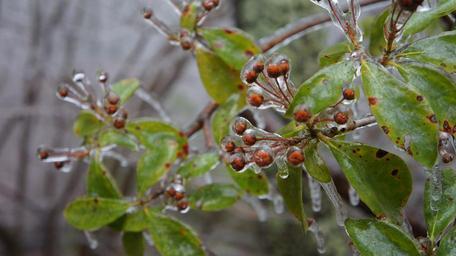 Keywords: plant winter ice frozen thick layer cold season nature closeup detail berries leaves icy frosty covered