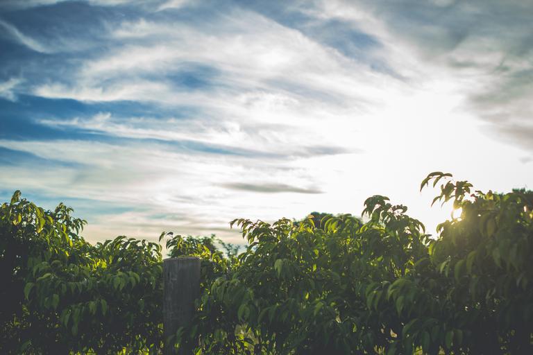 Keywords: plants nature trees green leaves fresh young spring growth gardening environment outdoor ecology lush sunshine fence overgrown plantation cultivation fruit agriculture