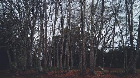 Keywords: plants wood forest birch trees white bark trunks nature autumn fall bare season dark outdoor environment botany