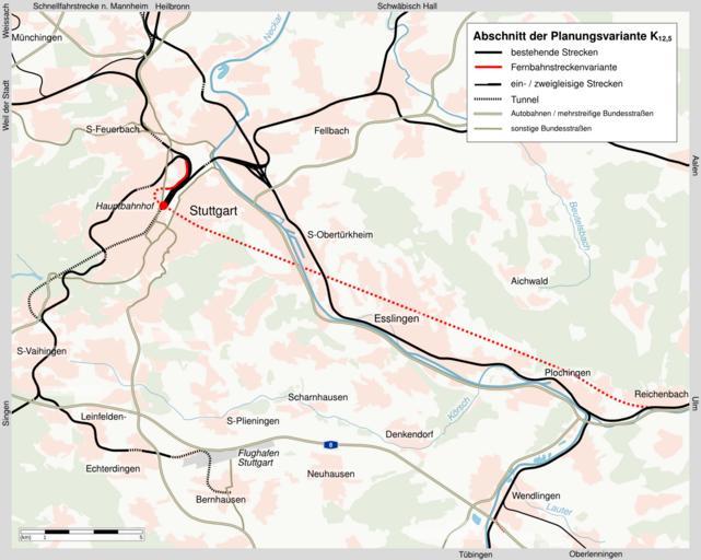 | Keywords: Planungsvariante K12-5.png en A map of the variant K 12 5 for a Stuttgart-Ulm high-speed railway line A ~20 km tunnel between Stuttgart and the area of Plochingen with a four-track station underneath a 16-track terminus to be kept was a key element of this variant While only the greater Stuttgart area is depicted on the map this line would have continued to Ulm The route is derived from the plans for the official approval process The underlying map is based on Karte_Stuttgart_21_aussen_Kartenwerkstatt svg a public domain map by K Jähne kjunix <br />While existing rail lines are depicted in black the new high-speed line is in red Dotted lines are used for tunnels de Karte zur nicht realisierten Planungsvariante K 12 5 für eine Schnellfahrstrecke zwischen Stuttgart und dem Raum Ulm Dargestellt ist der Großraum Stuttgart mit dem Fernbahntunnel Stuttgart gestrichelt der bis Ulm führenden Strecke Die Informationen stammen aus den Planfestellungsunterlagen zur Ausbau- und Neubaustrecke Stuttgart-Augsburg Teil B Bereich Kirchheim-Weilheim-Aichelberg von 1997 Die Karte basiert auf der gemeinfreien Datei Karte_Stuttgart_21_aussen_Kartenwerkstatt svg von K Jähne kjunix own Stoeffler 2011-04-22 Cc-zero Maps of project Stuttgart 21 |
