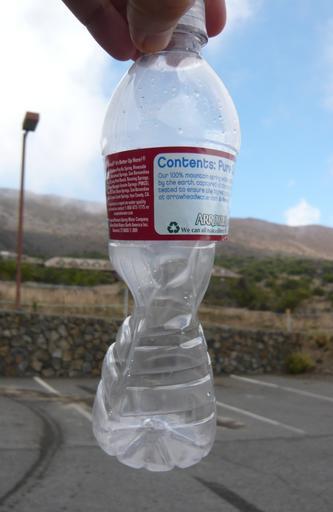 | Keywords: Plastic bottle at 9000 feet, sealed at 14000 feet.png en Plastic bottle sealed at 14 000 feet on Mauna Kea observatory on the island of Hawaii taken down to 9000 feet where the air pressure is crushing the botte own Quantockgoblin 2009-07-02 Air pressure Plastic bottles |