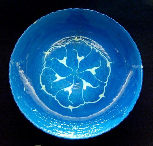 | Keywords: Plate Kirman UCAD 11945.jpg Plate Iran Kerman province Earthenware with champlevé decoration over coloured slip and under transparent glaze Plat Iran province de Kerman XVIe siècle Céramique siliceuse à décor champlevé sur engobe coloré et sous glaçure transparente century 16 Institution Louvre Department of Islamic Art Denon Espace B vitrine 90A object history credit line ProvenanceEvent gift Mr and Mrs Raymond Koechlin 1905 ProvenanceEvent deposit Musée des Arts décoratifs de Paris 1993 accession number UCAD 11945 own photo date 2006 Marie-Lan Nguyen artwork license PD-old-100 photo license other versions Ceramics of Iran in the Louvre Ceramic plates Blue plates Objects with black background Decorative plates Islam art in the Louvre - Room B |