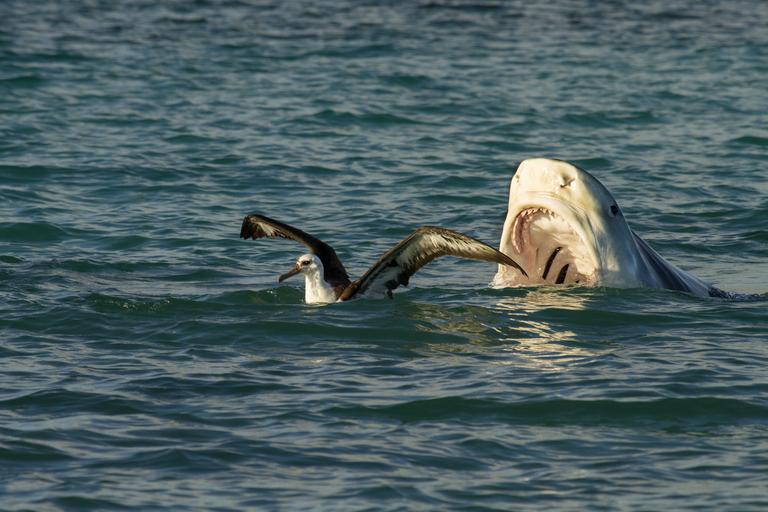 | Keywords: A tiger shark / Niuhi (Galeocerdo cuvier), seen going for a bite out of an unsuspecting Laysan Albatross / Moli, (Phoebastria immutabilis) off of Lisianski Island in Papahānaumokuākea Marine National Monument.