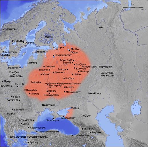 Keywords: Κράτος Ρως.png Map of the Kievan Rus in Greek Used the blank version of Kievan Rus map from Wiki Commons 2007-02-15 own assumed Panagiotis Botsis Maps of Kievan Rus