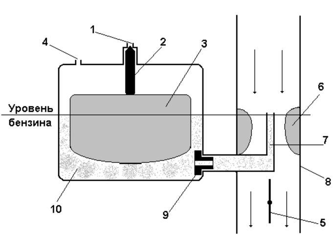 Keywords: Схема простейшего карбюратора.png Схема п остейшего ка бю ато а Schematic diagram of a carburetor Schéma d'un carburateur Schema van een carburator 1 Benzinetoevoer 2 Vlotternaald 3 Vlotter 4 Beluchtingsopening 5 Gasklep 6 Venturi 7 Sproeier 8 Venturibuis 9 Sproeieropening own 2007 Vovan1031 Carburetors |