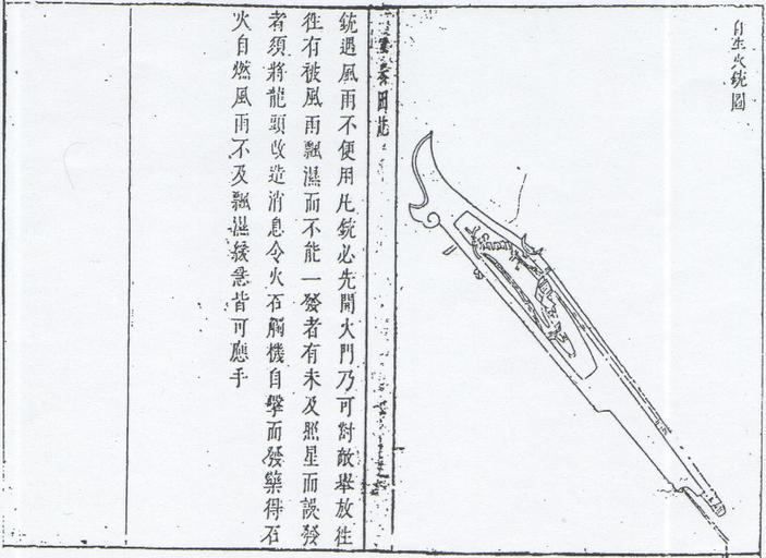 Keywords: 自生火銃.png en Ming flintlock gun zh 明代的自生火銃(燧發銃) 軍器 說 畢懋康 明崇禎十 年(1638年) PD-Art Flintlock firearms Flintlock muskets