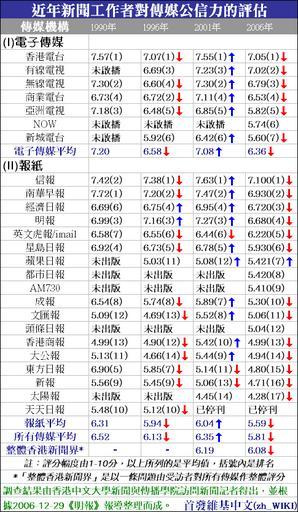 Keywords: 香港傳媒公信力評估.PNG 香港傳媒公信力評估 調查結 由香港中文大學新聞與傳播學院訪問新聞記 得出,並根據2006-12-29 明報 報導整理 成 2006-12-31 own assumed Da167168 Culture of Hong Kong Journalism