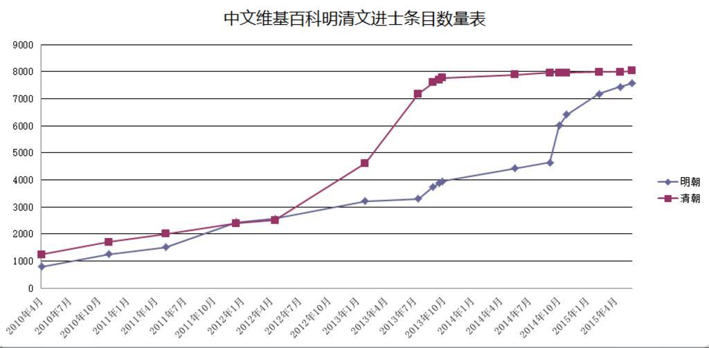 Keywords: 中文维基百科明清文进士条目数量表.png zh 2010-2015 4 中文维基百科明清文进士 目数量表 own Walter Grassroot Chinese Wikipedia