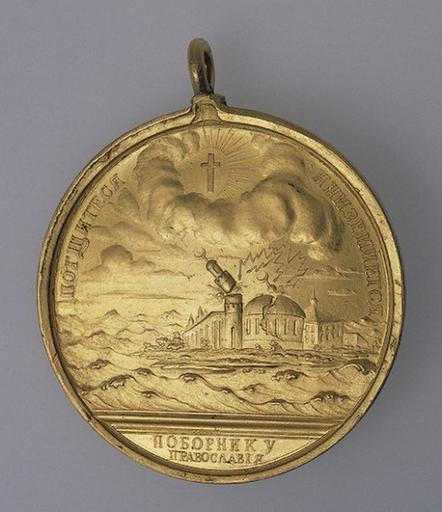 | Keywords: Poborniku Pavoslavia 20.jpeg  ru Эта медаль «Побо нику п авославия» в 20 че вонцев выпущена в пе иод Пе вой А хипелагской экспедиции 1769-1775 годов  и п оекта ни документов на изготовление этих медалей в а хивах не сох анилось В публикациях Ю Б Иве сена они названы « едалями на ныняшний военный случай» указано что чеканили их из золота и  азного достоинства  в 20 15 12 5 и 3 че вонца Эта медаль на 20 че вонцев найдена  усскими водолазами на дне Чесменской бухты в 1889 году П едположительно п инадлежала Федо у Г иго ьевичу О лову б ату командующего экспедицией Алексея Г иго ьевича О лова уте яная в момент Чесменской битвы в 1770 году http //s30983408019 mirtesen ru/blog/43092369723 Author 1770 PD-RU-exempt orders decorations and medals Medals of the Russian Empire Russo-Turkish Wars PD-old-100 |