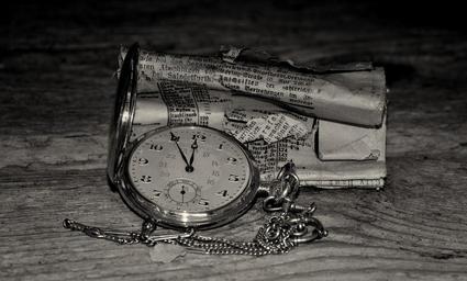 Keywords: pocket watch clock jewellery gold clock face newspaper rolled crumpled wooden table close antique old black and white recording