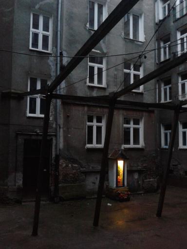 Keywords: Podwórko Waliców 12.jpg pl Podwórko kamienicy przy ulicy Waliców 12 domy podparte belkami w celu ochrony przed zawaleniem Widoczna także kapliczka 2016-11-17 15 38 25 own Obserwatoriusz other versions cc-zero Waliców Street in Warsaw