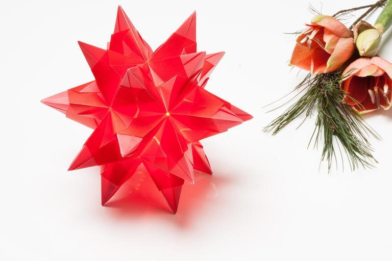 Keywords: poinsettia origami art of paper folding fold 3 dimensional object star geometric body red shiny amaryllis christmas table decorations