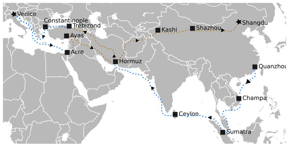 | Keywords: Polo's journey.svg Map showing Marco Polo's journeys to and from China Brown lines indicate land trips; blue lines sea trips Countries are indicated with modern borders; these are for context only Note Although certain places are know to be on his route thousands of miles in between is largely unaccounted for Route details are drawn from the Encyclopedia Britannica online edition BlankMap-World6 svg 2009-07-09 14 57 UTC BlankMap-World6 svg en User Canuckguy SkyBon<sup>TalkContributions</sup> derivative work Jarry1250 <span class signature-talk >talk</span> Maps of Marco Polo's travels |