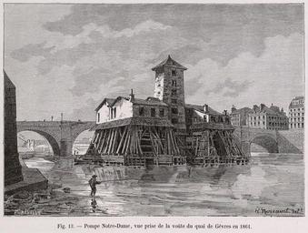 | Keywords: Pompe Notre-Dame, vue prise de la voûte du quai de Gêvres en 1861.jpg Artwork This print shows the Pompe Notre-Dame or Notre-Dame Pump originally built in 1670 then reconstructed in 1708 This pump channeled waters from the Seine into many public fountains and monuments allowing the fountains to shoot water from twelve up to fifty feet in the air Here shown in 1861 the pump looks rather destitute and neglected next to the Pont-Notre Dame The Pont underwent much renovation during the 19th century while the pump remained virtually untouched 1875-1882 lithograph 10 6 x 15 2 cm Institution Brown University Library object history exhibition history credit line Published in Theodor Josef Hubert Hoffbauer Paris à travers les âges Paris Firmin-Didot et cie 1885 accession number 11636924890 PD-old Lithographs of Paris Images of Paris from the Brown University Library Paris à travers les âges |