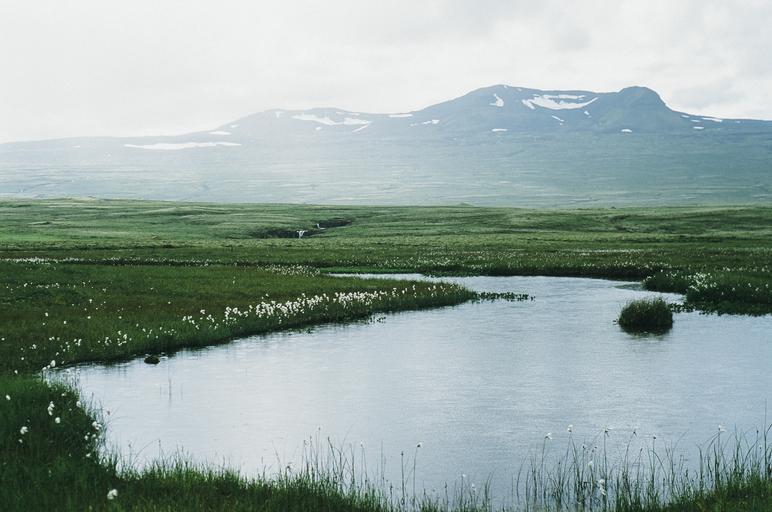 Keywords: pond water fields green grass mountains hills valleys snow peaks