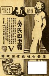 | Keywords: Ponds Bai Yushuang.png Pond's Vanishing Cream featuring Ping Opera star Bai Yushuang Box in lower right corner edited to remove digital watermark from public-domain image s 1920 or '30s http //www2 jslib org cn/was5/web/search page 3 channelid 44053 perpage 12 outlinepage 10 Nanjing Library Digital Archive zh icon Pond's other versions PD-China PD-US-1996 LlywelynII Bai Yushuang Advertisements in China Pond's Qipao Skin care advertisements 1920s advertisements in China 1930s advertisements in China |