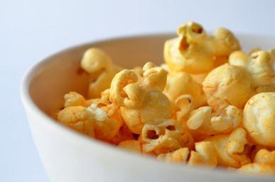 Keywords: popcorn salted bowl view close close-up yellow white food snack corn maize fried puffed container