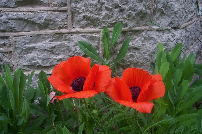 Keywords: poppies red flowers green plants leaves stems colorful blooms blossoms blooming poppy flowering ornamental stone walls backgrounds grey gray