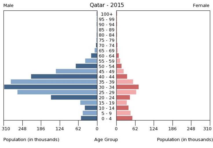| Keywords: Population pyramid of Qatar 2015.png en A population pyramid illustrates the age and sex structure of population and may provide insights about political and social stability as well as economic development The population is distributed along the horizontal axis with males shown on the left and females on the right The male and female populations are broken down into 5-year age groups represented as horizontal bars along the vertical axis with the youngest age groups at the bottom and the oldest at the top The shape of the population pyramid gradually evolves over time based on fertility mortality and international migration trends Віково-статева пі аміда населення Ката у за 2015 ік Вона дає наочне уявлення п о вікову і статеву ст укту а населення к аїни може слугувати дже елом інфо мації п о політичну і соціальну стабільність економічний озвиток Блакитними кольо ами ліво уч у вигляді го изонтальних смуг показані вікові г упи по 5 оків кожна чоловічої статі п аво уч ожевими жіночої аймолодші вікові г упи внизу найста іші вго і Фо ма пі аміди поступово еволюціонує з плином часу під впливом чинників на оджуваності сме тності і світової міг ації https //www cia gov/library/publications/the-world-factbook/ The World Factbook 2016-09-21 The Central Intelligence Agency Цент альне озвідувальне уп авління PD-USGov Population pyramids of Qatar |