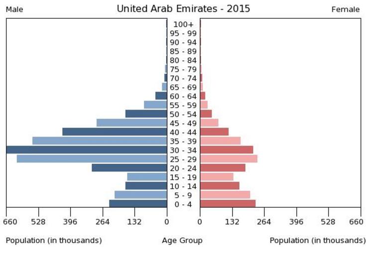 Keywords: Population pyramid of United Arab Emirates 2015.png en A population pyramid illustrates the age and sex structure of population and may provide insights about political and social stability as well as economic development The population is distributed along the horizontal axis with males shown on the left and females on the right The male and female populations are broken down into 5-year age groups represented as horizontal bars along the vertical axis with the youngest age groups at the bottom and the oldest at the top The shape of the population pyramid gradually evolves over time based on fertility mortality and international migration trends Віково-статева пі аміда населення Об'єднаних А абських Емі атів за 2015 ік Вона дає наочне уявлення п о вікову і статеву ст укту а населення к аїни може слугувати дже елом інфо мації п о політичну і соціальну стабільність економічний озвиток Блакитними кольо ами ліво уч у вигляді го изонтальних смуг показані вікові г упи по 5 оків кожна чоловічої статі п аво уч ожевими жіночої аймолодші вікові г упи внизу найста іші вго і Фо ма пі аміди поступово еволюціонує з плином часу під впливом чинників на оджуваності сме тності і світової міг ації https //www cia gov/library/publications/the-world-factbook/ The World Factbook 2016-09-21 The Central Intelligence Agency Цент альне озвідувальне уп авління PD-USGov Population pyramids of the United Arab Emirates |