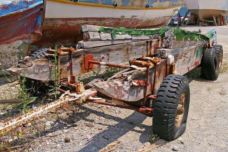 Keywords: port facility boottrailer old rusted stainless metal decay corrosion weathered auburn deposit oxidation time mature auto tires axis turned off