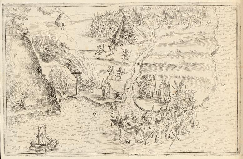 | Keywords: Port Fortuné, altercation.tif fr Altercation de Port Fortuné entre Français et des Indiens Nauset 1606 A Le lieu ou eÅ¿toiet les François Å¿aiÅ¿ans le pain B Les Å¿auuages Å¿urprenans les François en tirant Å¿ur eux à coups de fleÅ¿ches C François bruflez par les Å¿auuages D François s ™enfuians à la barque tout lardés de fleÅ¿ehes E Trouppes de fauuages faiÅ¿ans bruÅ¿ler les François qu ™ils auoient tués F Montaigne fur le port G Cabannes des Å¿auuages H François à terre chargeans les Å¿auuages I Sauuages desfaicts par les François L Chalouppe où eÅ¿toient les François M Sauuages autour de la chalouppe qui furent Å¿urpris par nos gens N Barque du Å¿ieur de Poitrincourt O Le port P Petit ruiÅ¿eau Q François tombez morts dans l ™eau penÅ¿ans Å¿e Å¿auuer à la barque R RuiÅ¿eau venant de certins mareÅ¿cages S Bois par où les Å¿auuages venoient à couuert 1613-01-01 http //memory loc gov/master/rbc/rbfr/0012/01720000 tif Samuel de Champlain other versions 41 681944 -69 960278 PD-old-70-1923 Samuel de Champlain History of North America United States in the 1610s |