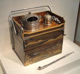 Keywords: Portable tobacco set, Japan, Edo period, lacquer on wood with gold and silver, silver fittings and components - Freer Gallery of Art - DSC05514.JPG en Exhibit in the Freer Gallery of Art Washington DC USA This artwork is old enough so that it is in the public domain Photography was permitted in the museum without restriction 2013-02-12 15 34 08 own Daderot cc-zero Art of Japan in the Freer Gallery of Art Uploaded with UploadWizard Tobacco containers from Japan |