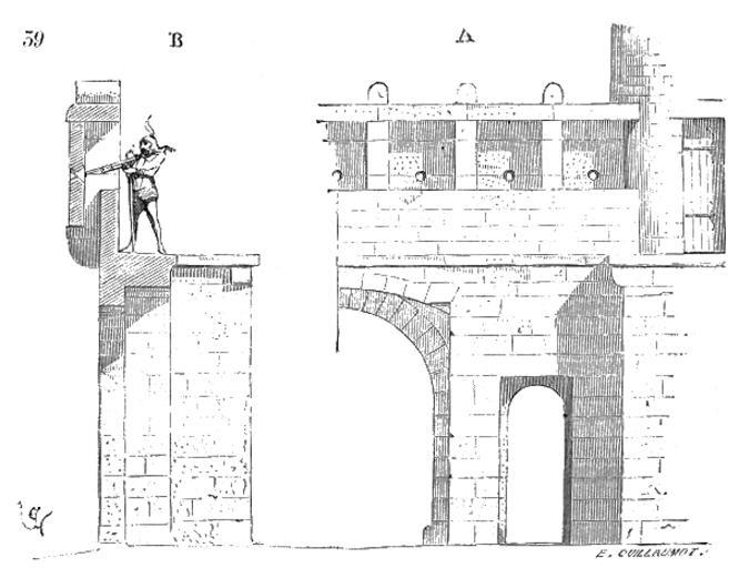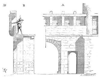 Keywords: Porte.Flavigny.png Nous avons un exemple de ces changements dans une des portes antérieures de la petite ville de Flavigny Côte-d'Or Cette porte fig 38 est encore flanquée de deux tours cylindriques percées de meurtrières à la base à mi-hauteur et au sommet Ces meurtrières faites pour de très-petites bouches à feu sont circulaires La porte elle-même ainsi que sa poterne est surmontée d'un mâchicoulis avec parapet percé également de meurtrières circulaires Cet ouvrage précède une porte du XIV<sup>e</sup> siècle en partie démolie aujourd'hui et qui était fermée par une herse et des vantaux La figure 39 donne en A la face intérieure de la porte présentée en perspective extérieurement dans la figure 38 Viollet-le-Duc Fortification Viollet-le-Duc Castle Viollet-le-Duc Portals Viollet-le-Duc Drawings of embrasures Flavigny-sur-Ozerain |