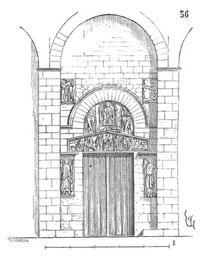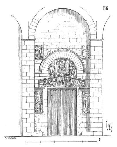 Keywords: Porte.Notre.Dame.du.Port.Clermont.png Une porte latérale de l'église de Notre-Dame du Port à Clermont Puy-de-Dôme nous fournit un spécimen bien caractérisé de ces baies d'églises auvergnates La figure 56 donne l'élévation extérieure de cette porte La baie est rectangulaire à vives arêtes sans ébrasements Un linteau d'une seule pièce renforcé dans son milieu supporte un tympan et est déchargé par un arc plein cintre Il y a dans cet exemple la trace d'une tradition antique évidente Deux figures les bras levés comme pour supporter une imposte saillante reçoivent les extrémités du linteau très-franchement accusé Ce linteau est décoré d'un bas-relief représentant l'adoration des mages et le baptême de Jésus Le tympan représente le Christ dans sa gloire bénissant avec deux séraphins Des deux côtés de l'archivolte deux groupes représentent l'annonciation et probablement la naissance du Christ ce dernier bas-relief étant très-altéré Viollet-le-Duc Drawings by Eugène Viollet-le-Duc Arch portals Semi-circular arches Discharging arches South portal of Notre-Dame du Port |