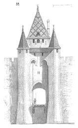 Keywords: Porte.Villeneuve.sur.Yonne.2.png l'élévation extérieure de la porte de Villeneuve-sur-Yonne Cette élévation fait saisir la double fonction des mâchicoulis obliques Toute cette construction est élevée en cailloux de meulière avec chaînes de pierre aux angles Elle est bien traitée et les mortiers en sont excellents C'est peut-être à la bonté de cette construction et au peu de valeur des matériaux que nous devons sa conservation Une coupe longitudinale faite sur la partie antérieure de la porte fig 33 fait voir la manœuvre du pont-levis et son mécanisme Des contre-poids suspendus en arrière des deux longrines du tablier facilitaient son relèvement lorsqu'on appuyait sur le treuil T La première herse abaissée le mâchicoulis qui la protége était ouvert aux défenseurs Dans cet exemple comme dans tous ceux précédemment donnés la défense n'agit que du sommet de la porte et par la disposition des échauguettes et des grands mâchicoulis obliques le fossé ainsi que les abords du pont pouvaient être couverts de projectiles Viollet-le-Duc Portes de Sens et de Joigny Gothic portals |