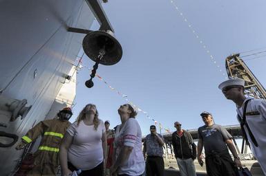 Keywords: Portland Fleet Week tours 150606-N-OO032-019.jpg en 150606-N-OO032-019 PORTLAND Ore June 5 2015 Guests take a moment to inspect engraving on USS Chosin's CG 65 ship's bell while on a tour of the Ticonderoga-class guided-missile cruiser during 106th annual Rose Festival and Portland Fleet Week Navy tradition dictates that when a child is christened aboard a Navy ship their name is engraved inside the ship's bell The festival and Portland Fleet Week are a celebration of the sea services with Sailors Marines and Coast Guardsmen from the U S and Canada making the city a port of call U S Navy Photo by Mass Communication Specialist 2nd Class Cory Asato/Released 2015-06-06 Petty Officer 2nd Class Cory Asato https //www dvidshub net/image/1979203 150606-N-OO032-019 2015-06-06 16 51 PORTLAND OR US PD-USGov-Military-Navy USS Chosin CG-65 Images from DoD uploaded by Fæ |