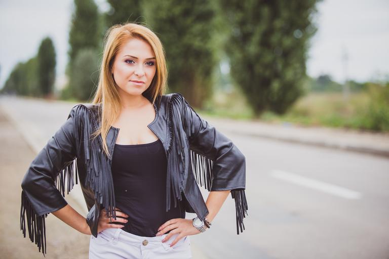 Keywords: portrait beauty make-up woman girl model in relation to blond road highway skin jacket